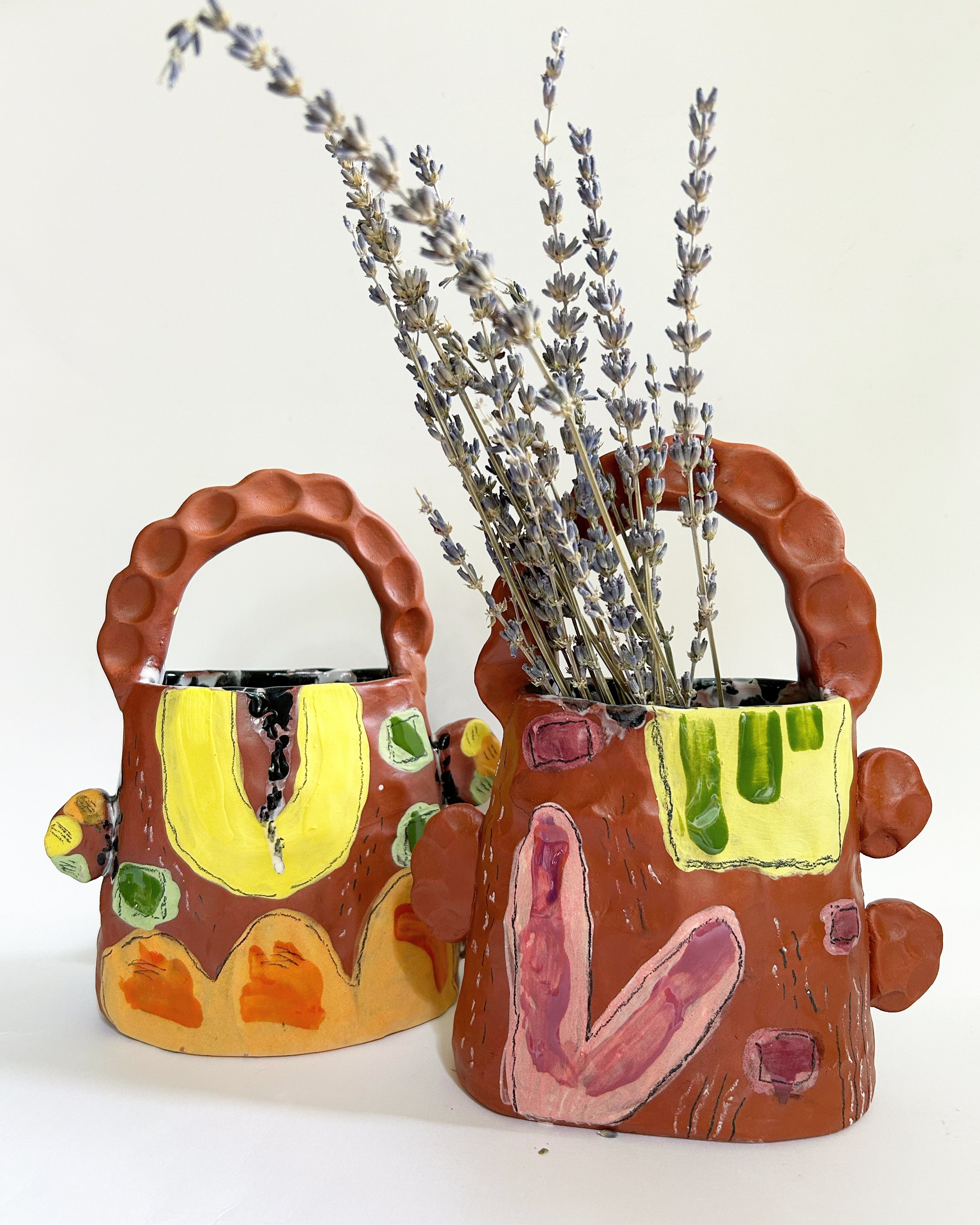 using a variety of clays and processes. Formed using methods of pinching and the potters wheel. Decorated with terra sig and underglaze. Think of them as functional paintings, Sculptures you can use. All functional wares are food safe and made to be used.