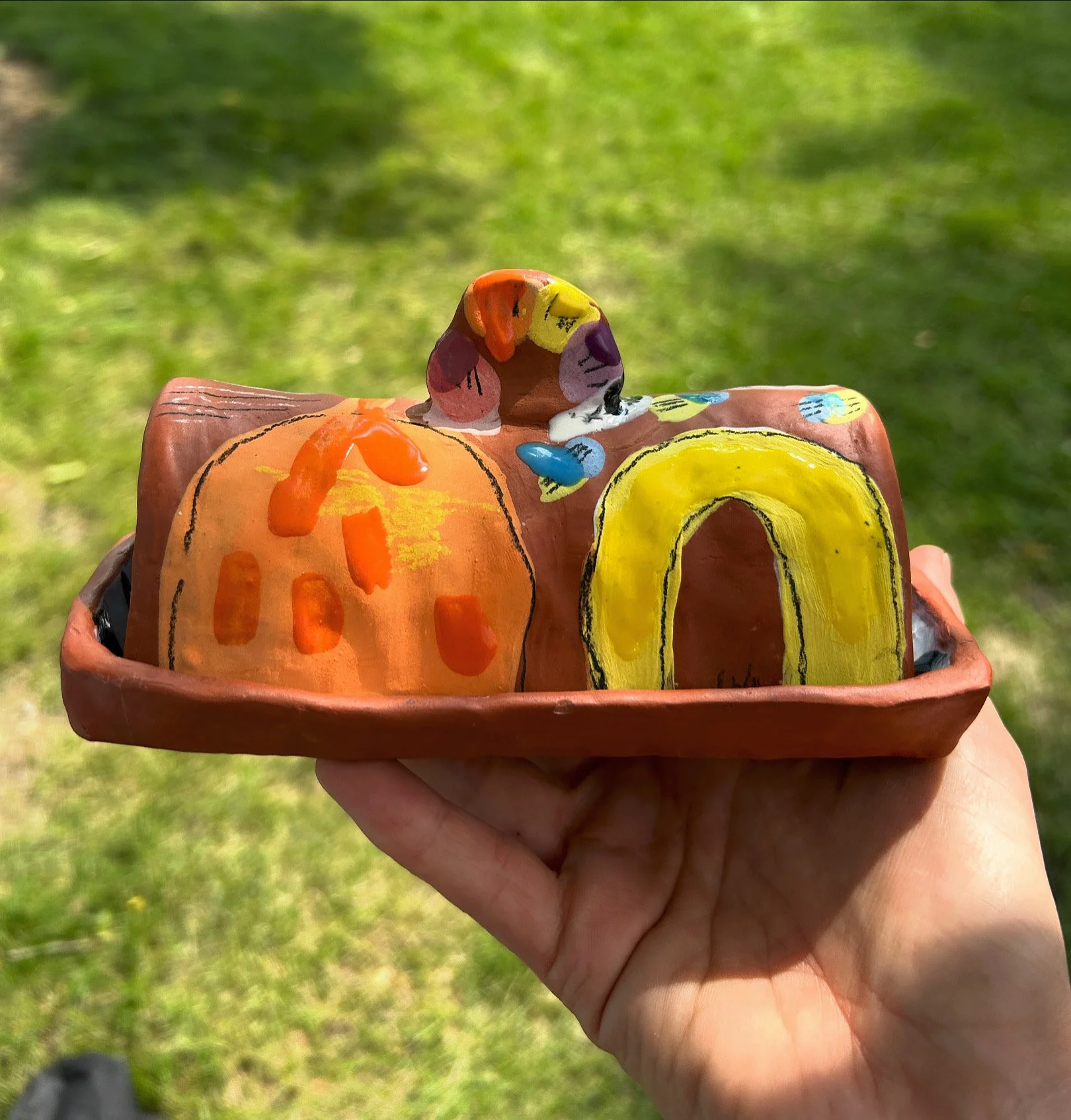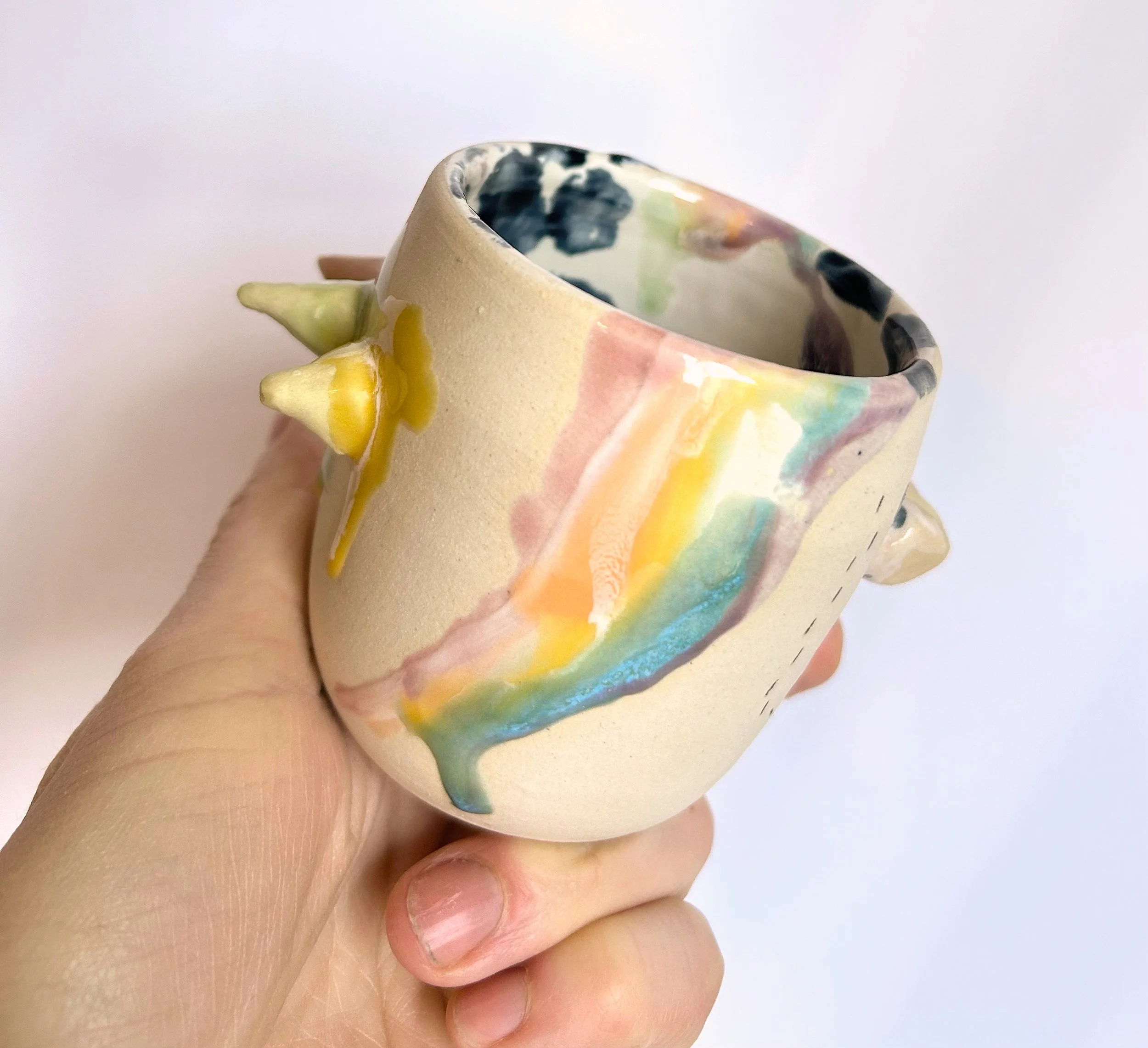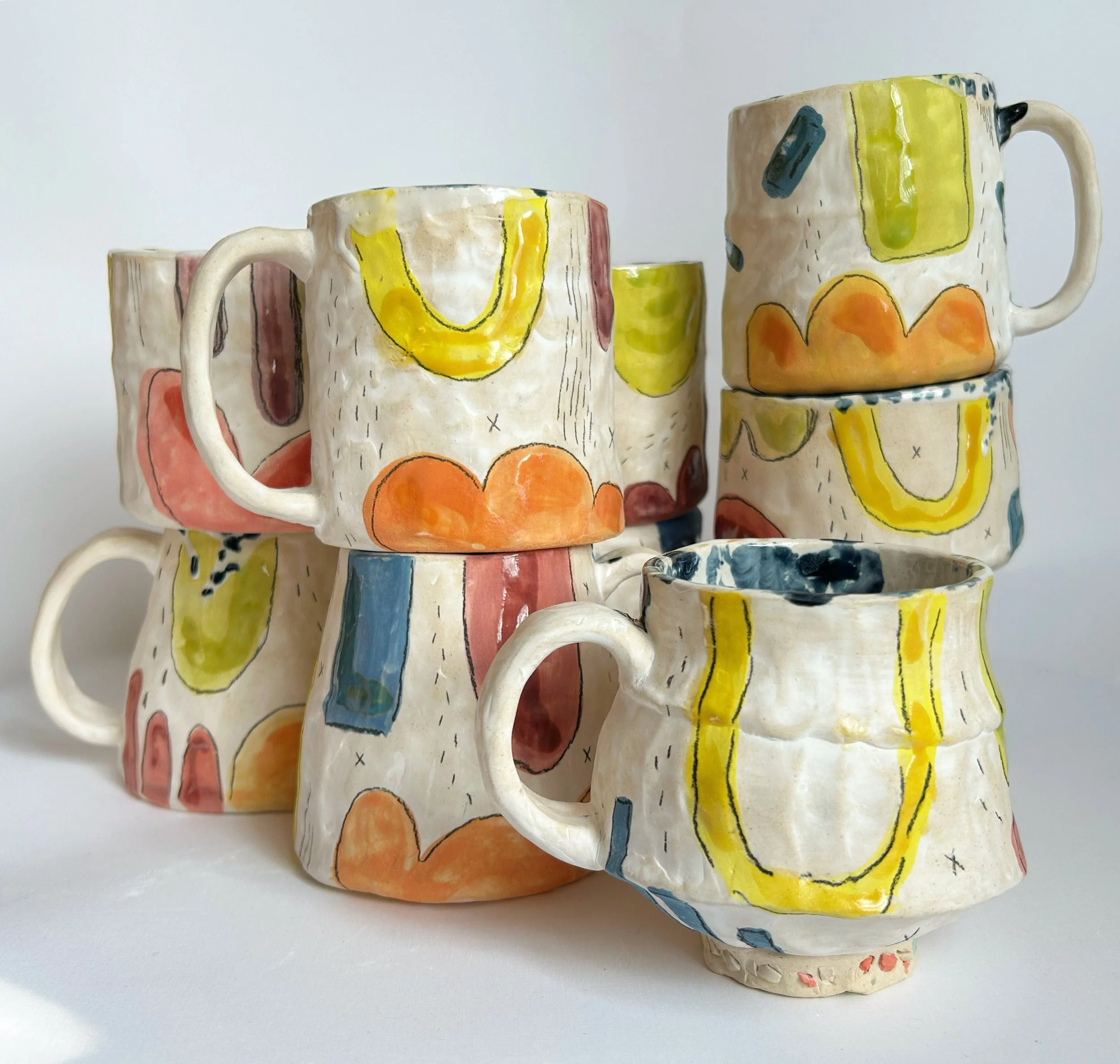 using a variety of clays and processes. Formed using methods of pinching and the potters wheel. Decorated with terra sig and underglaze. Think of them as functional paintings, Sculptures you can use. All functional wares are food safe and joyfully made. Dishwasher Safe, but hand wash recommended.