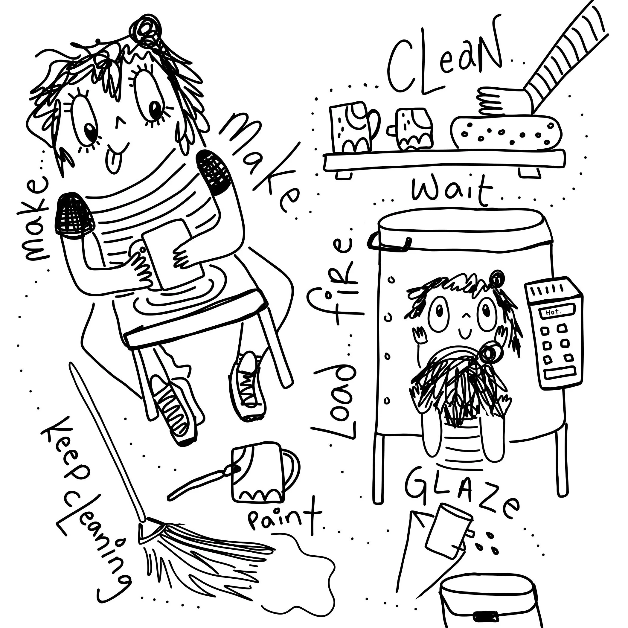 “I use techniques of pinching, wheel throwing, and slab building to form wares which are then decorated using slip, terra sig, slip, glaze, underglaze and or the underglaze pencil. When working in clay I aim to create bright and playful wares that are a conversation between the clay, color, and form. I’m interested in the way clay records our every choice; throw lines, finger prints, brush strokes, even sometimes our moods. I’m interested in the way colours and patterns play upon different clay bodies and aim to create a dynamic and playful surface that compliments the personality of the clay on which it’s painted. My patterns and illustrations respond to life. I draw what I know and experience.”